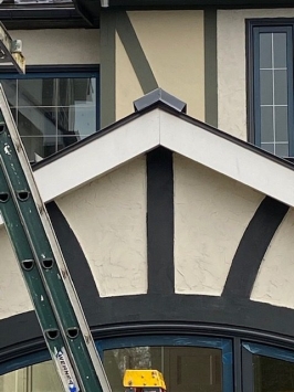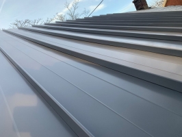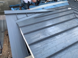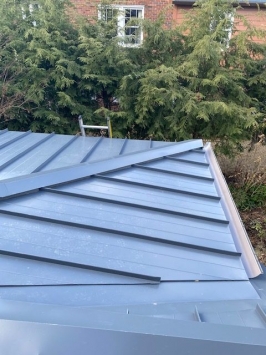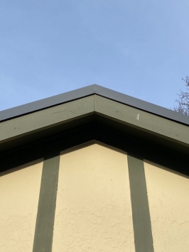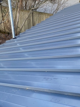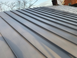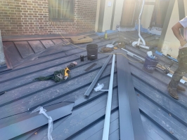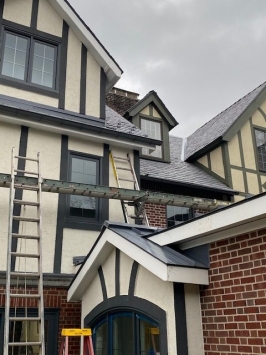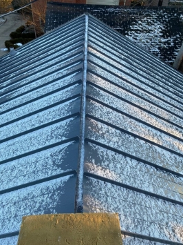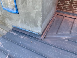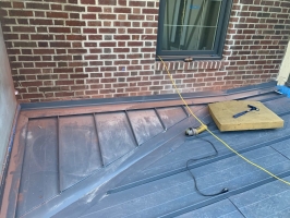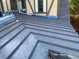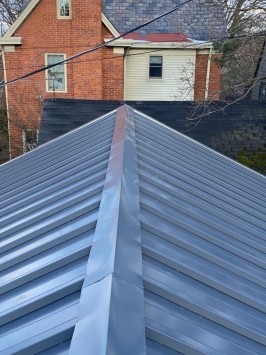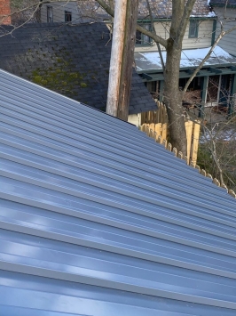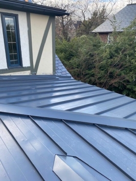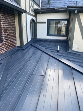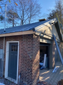 This was part of a larger engineered slate project. The owners had a new kitchen addition built and wanted to install aluminum standing seam roof panels. We settled on Dutch Seam panels by ATAS International in charcoal gray. The owners then decided to install the same product on their detached garage. Beautiful.